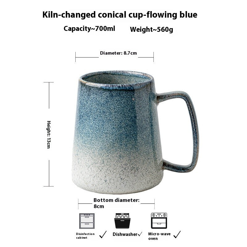 Crafted with an eye-catching kiln-fired glaze, this large ceramic mug showcases flowing, stream-like color patterns that make each piece uniquely beautiful. The conical shape adds a modern touch, while the optional lid and spoon make it perfect for cozy home routines.